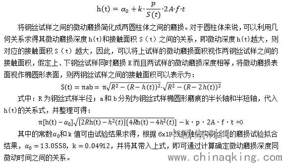 可以用兩鋼絲試樣之間的接觸載荷與接觸面積之比來表示其接觸應力;鋼絲試樣之間的接觸面積是微動磨損時間的函數,可以用S(t)表示;而鋼絲試樣之間的相對微動速度取決于微動振幅和往復頻率,因此上式可改寫為: