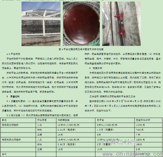 就針對輕型采光類穹頂使用常規操作架體,嚴重影響施工過程中各專業交叉施工作業、對整個項目施工周期有較大影響,同時存在交叉作業中較大安全隱患。采用鋼絲繩軟平臺既可以滿足采光頂自身施工需要和安全保障,又避免了多專業交叉施工的危險,對于該種新技術,有較大的社會效益,符合國家鼓勵的四新技術落實。