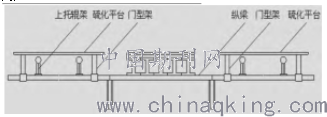 為了提高工作效率,我們專門加工四個門形架,其高度稍高于帶式輸送機上托輥的高度。硫化前,每兩個門形架為一組橫跨在上托輥的上方,并在機架上固定牢固后鋪上平板,兩個硫化平臺即搭設完畢(如圖1所示)。然后在兩個平臺之間只需拆除3架上托輥架,鋪設硫化底梁、水壓板、隔熱板和下加熱板,該工序即可完成。與通常的施工方案相比,可節約時間1h。