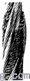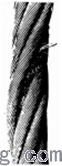D型鋼絲繩為點接觸鋼絲繩(股內各鋼絲直徑相同),即普通型鋼絲繩,它由絲徑相同的鋼絲組成,其相鄰的各層鋼絲節距不相等(鋼絲繩節距是指一股繞繩的中心線扭擰一圈兩點之間的距離),受力后各鋼絲之間成點接觸;X型為線接觸鋼絲繩;DX型為點、線接觸鋼絲繩;C型為填充式鋼絲繩;T型為外粗式鋼絲繩(繩股中外層鋼絲直徑大于內層鋼絲直徑,且同層鋼絲直徑相同);Y型為粗細式鋼絲繩(同層或不同層的鋼絲直徑不相同)。