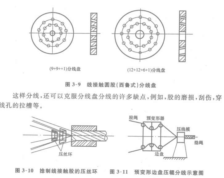 捻制線接觸圓股時,為了讓各鋼絲在捻制錐里有條不紊地進入各自的股層,除了使用分線盤之外,還可配上壓絲環,見圖3-10。